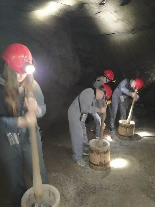 Pierwszego dnia uczniowie klas VIIa, VIIb, VIIe przemierzyli Trasę Górniczą w Kopalni Soli w Wieliczce wpisanej do krajowego rejestru zabytków. Wyjątkowe kombinezony, kaski ochronne, latarki, maski, szkolenie – to początek lekcji o wydobyciu soli kamiennej. Pod okiem doświadczonego przewodnika poznawaliśmy historię eksploatacji złóż soli, wędrując krętymi korytarzami pod ziemią, dotykaliśmy ścian pokrytych kryształkami soli. Poszukiwanie stalaktytów, stalagmitów, stalagnatów, groty z pięknym żyrandolem, możliwość rozdrabniania, nakładania i próbowania soli – wszystko było ciekawym, nowym doświadczeniem i świetnym sposobem zdobywania wiedzy.