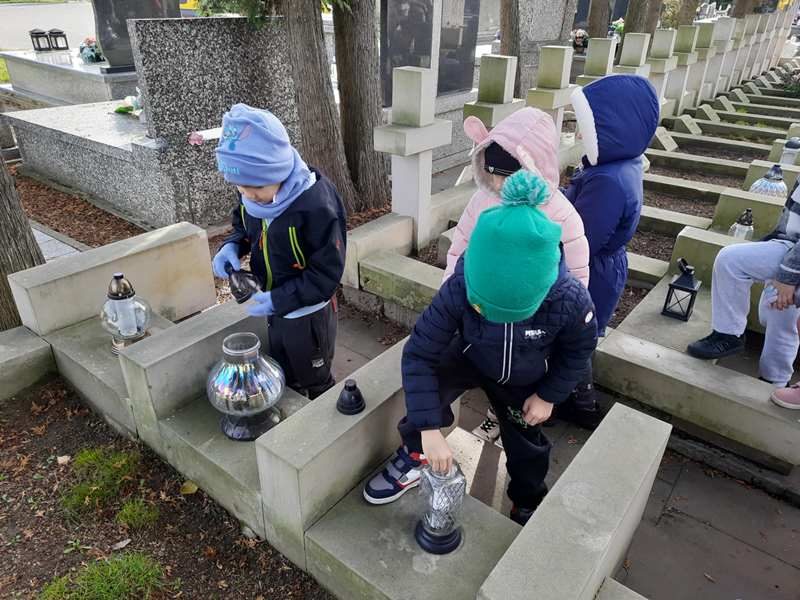 Symboliczne światełka zapłonęły także na cmentarzu, by w ten sposób w imieniu całej społeczności szkolnej oddać szacunek i hołd tym, którzy odeszli. Chwile ciszy i modlitwy przy pomnikach i mogiłach to wyraz wdzięczności okazany zmarłym nauczycielom, pracownikom szkoły, proboszczom i żołnierzom.