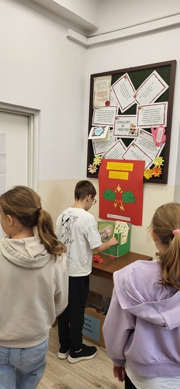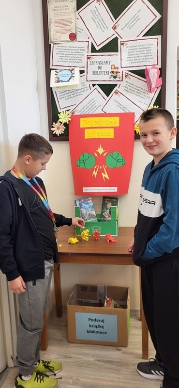 - Atrakcja biblioteczna „Pojedynek książek” – uczniowie klas III–VI mogli głosować na ciekawszą lekturę lub ulubioną książkę. Pomysł spotkał się z dużym zainteresowaniem i stał się stałym elementem działalności naszej biblioteki.