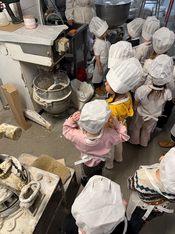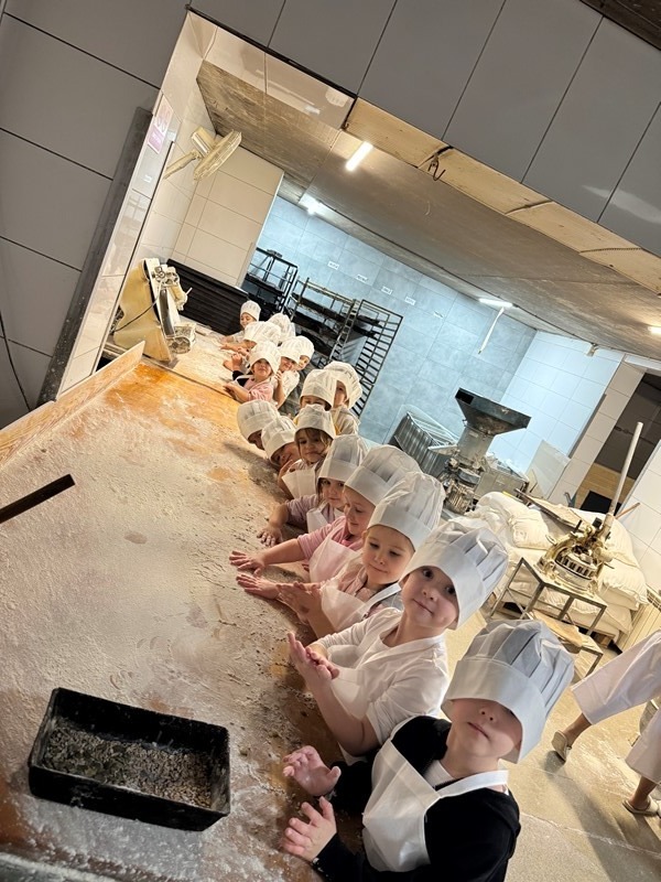 W samym środku krainy czekała na nich Mistrzyni Mącznych Zaklęć – Pani Iwona Sypniewska. Ubrana w strój piekarski wyglądała jak prawdziwa czarodziejka, gotowa pokazać dzieciom, jak powstaje chleb. Machnęła drewnianą łopatą niczym różdżką i rozpoczęła się przygoda. Najpierw przedszkolaki poznały sekretne składniki chlebowego zaklęcia: mąkę, wodę, drożdże i odrobinę cierpliwości. Potem przyszła pora na najzabawniejszą część — wyrabianie ciasta! Bułki skakały, ciasto uciekało spod palców, Pani Iwona rzucała drożdżowe kule do dzieci, a niektóre Jeżyki miały na swoich noskach resztki mąki wszechobecnej w tym cudownym miejscu. Sówki, Jeżyki, Jagódki i przedszkolaki z 0d kręciły, wałkowały i ugniatały swoje bochenki, a gdy już były pięknie uformowane przyszedł czas na ich wędrówkę do pieca.