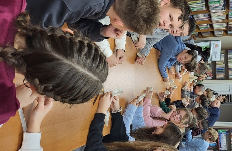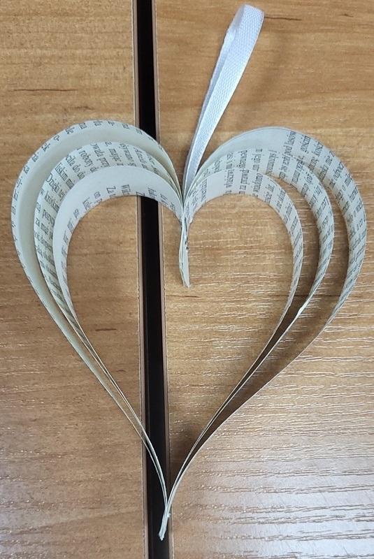 W czytelni czekała na wszystkich miła niespodzianka. Uczniowie pod kierunkiem bibliotekarzy wykonali oryginalne serduszka i choinki wykorzystując kartki zniszczonych książek. Dzięki takiemu pomysłowi książki zyskały jakby drugie życie.