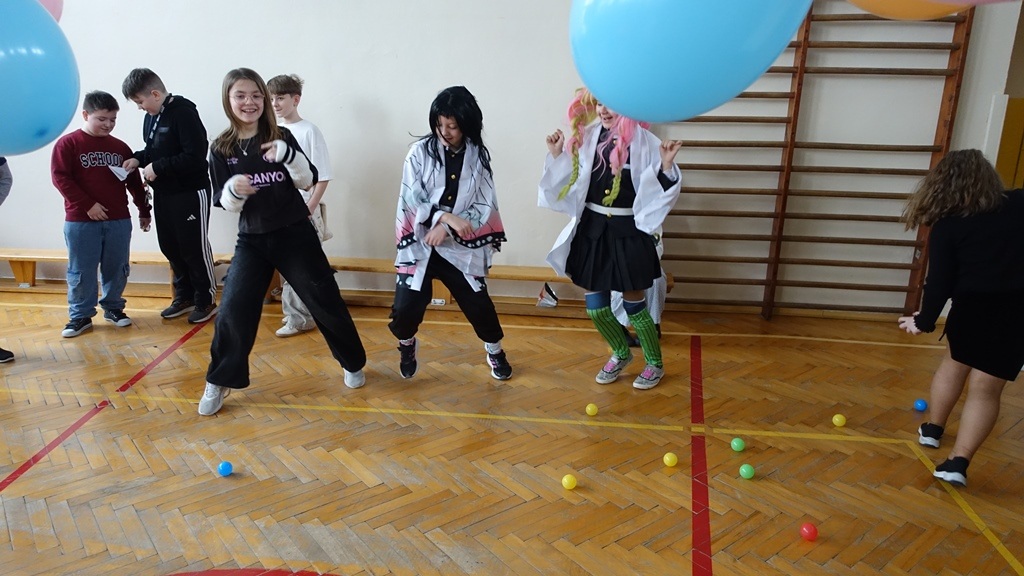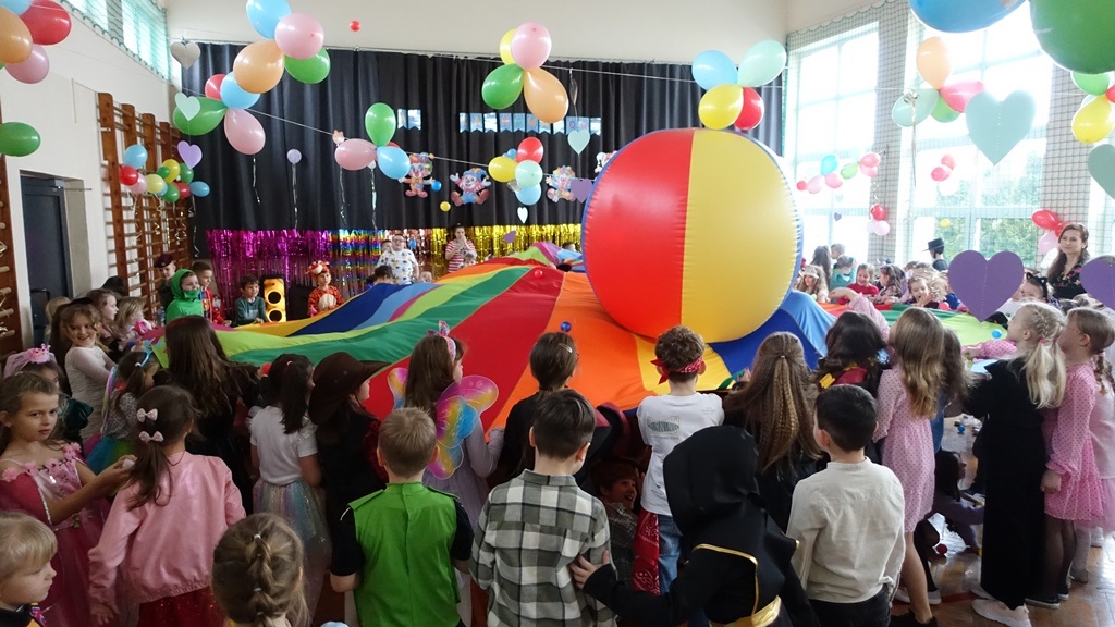Zabawę rozpoczęliśmy wspólnym tańcem, który szybko porwał wszystkich na parkiet. Przy dźwiękach najpopularniejszych przebojów uczniowie tańczyli, śpiewali i świetnie się bawili. Nie zabrakło również konkursów i zabaw integracyjnych, takich jak taniec z balonem, konkurs na najciekawsze przebranie czy zabawy ruchowe prowadzone przez animatorów.