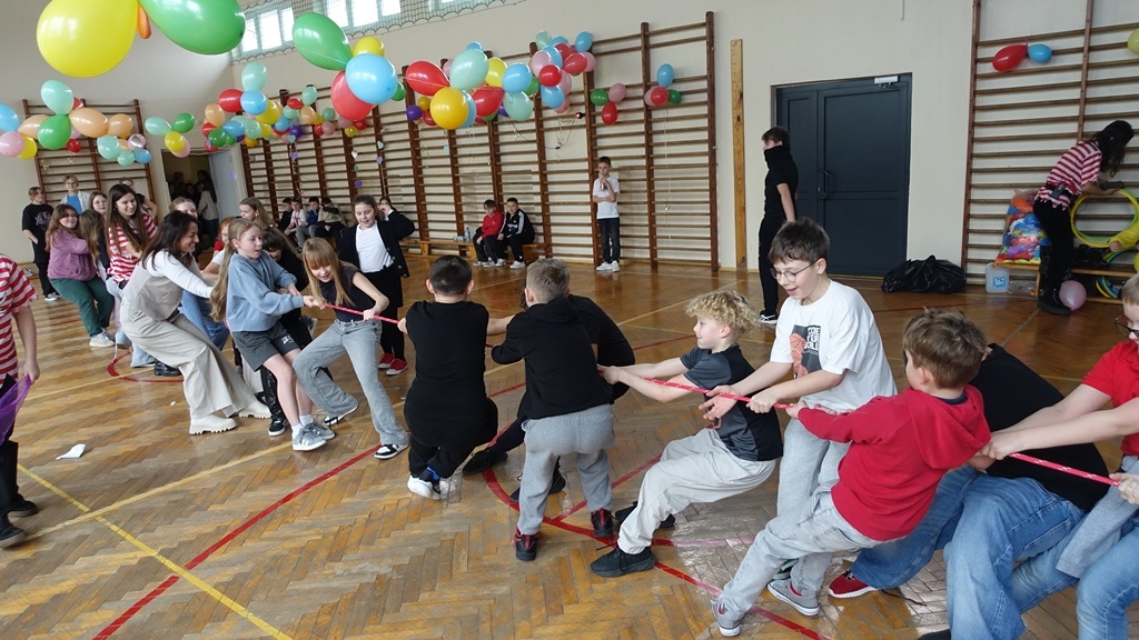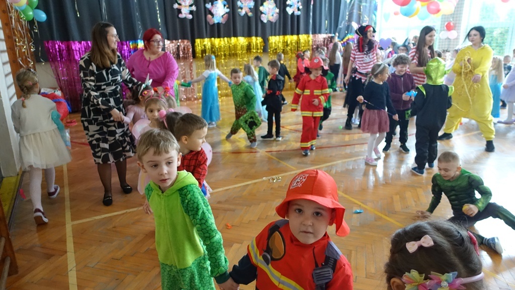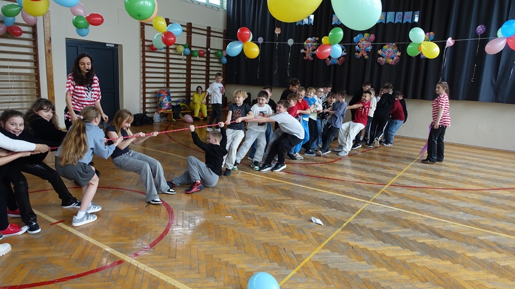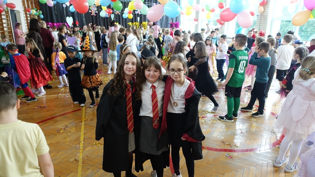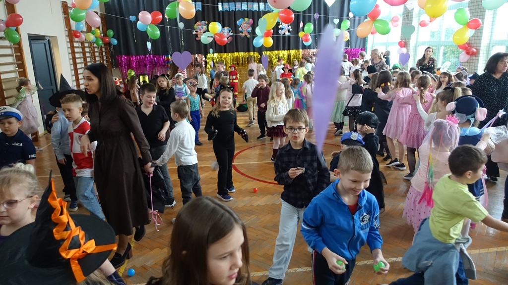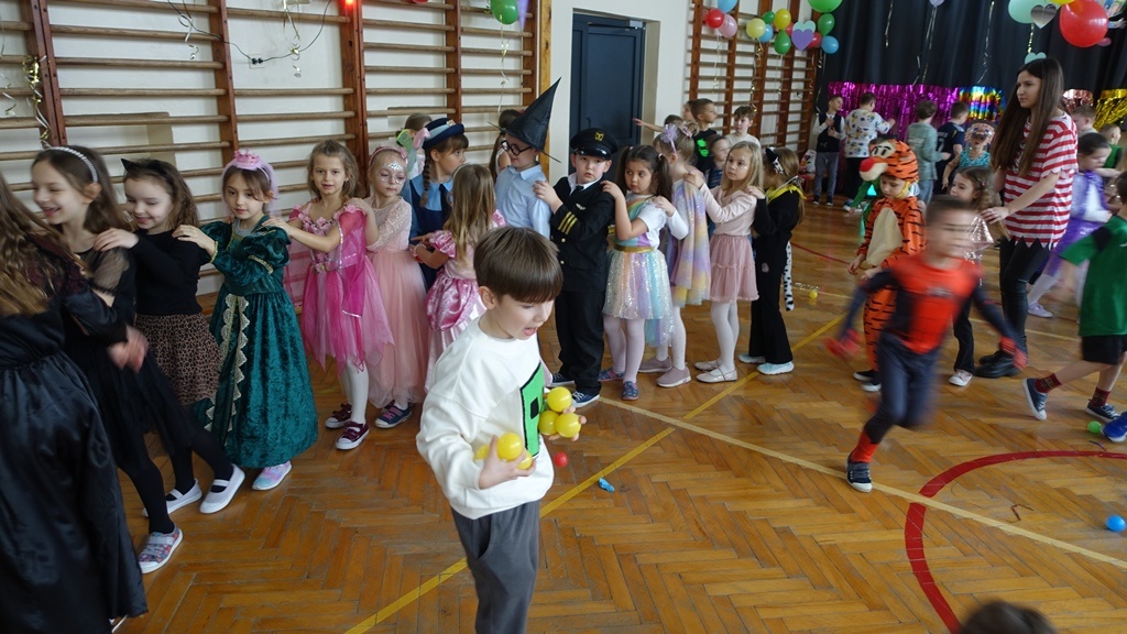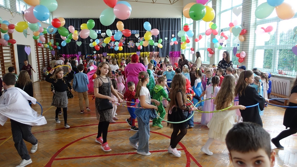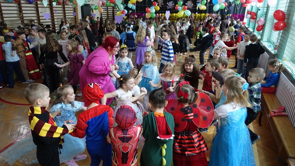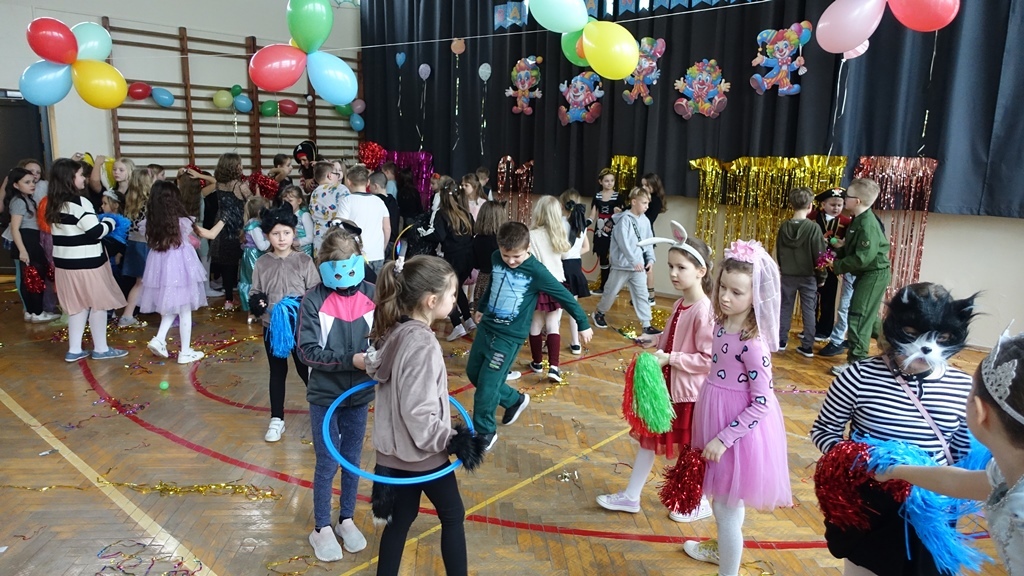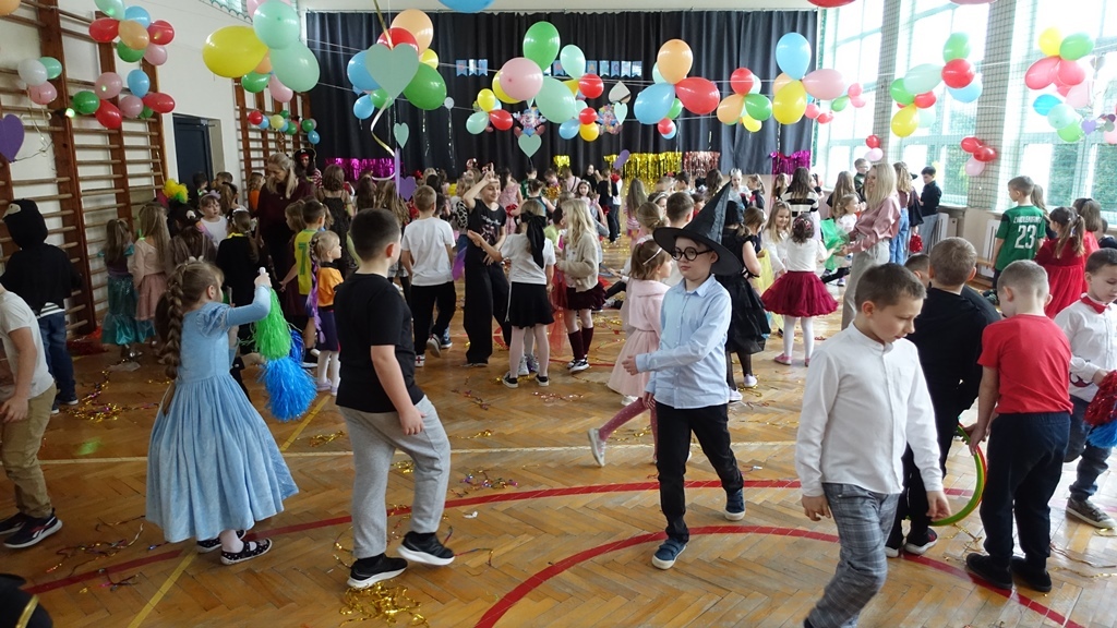 Karnawał to czas radości, muzyki i wspólnej zabawy. W miniony czwartek sala gimnastyczna zamieniła się w prawdziwą salę balową, pełną kolorowych dekoracji, balonów i migoczących świateł.