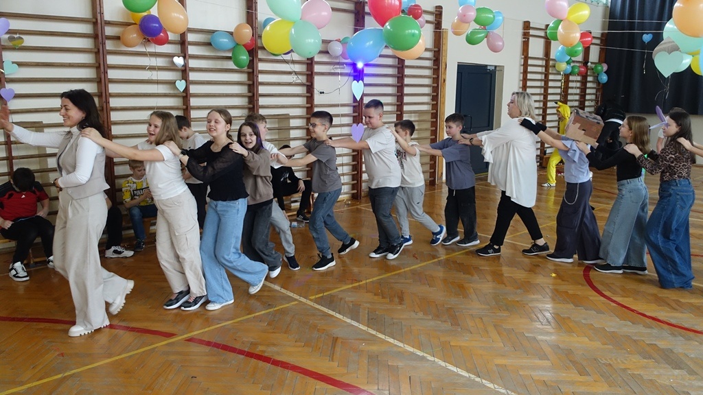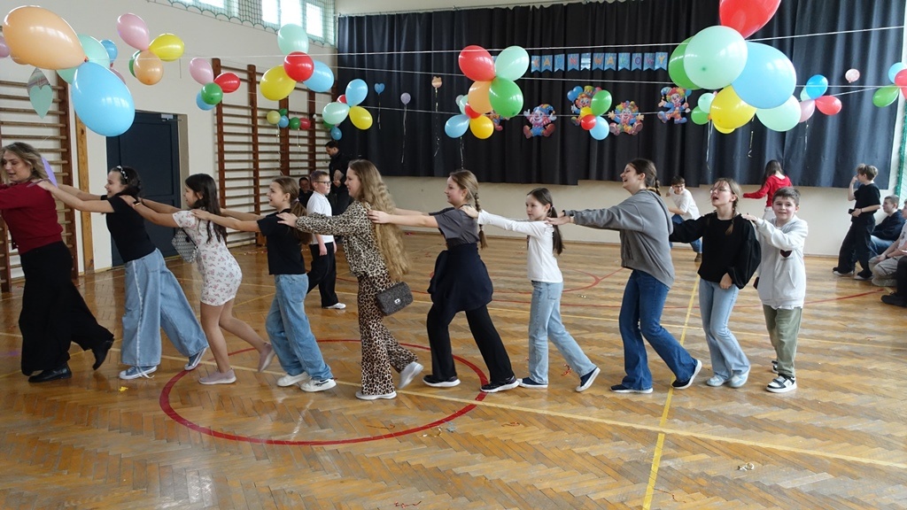 Karnawał to czas radości, muzyki i wspólnej zabawy. W miniony czwartek sala gimnastyczna zamieniła się w prawdziwą salę balową, pełną kolorowych dekoracji, balonów i migoczących świateł.