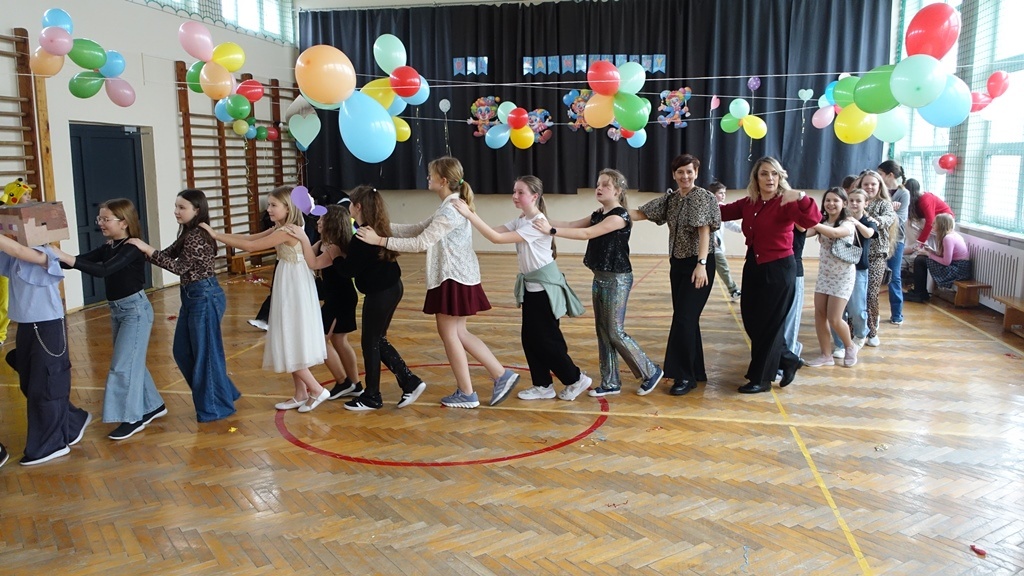 Zabawę rozpoczęliśmy wspólnym tańcem, który szybko porwał wszystkich na parkiet. Przy dźwiękach najpopularniejszych przebojów uczniowie tańczyli, śpiewali i świetnie się bawili. Nie zabrakło również konkursów i zabaw integracyjnych, takich jak taniec z balonem, konkurs na najciekawsze przebranie czy zabawy ruchowe prowadzone przez animatorów.
