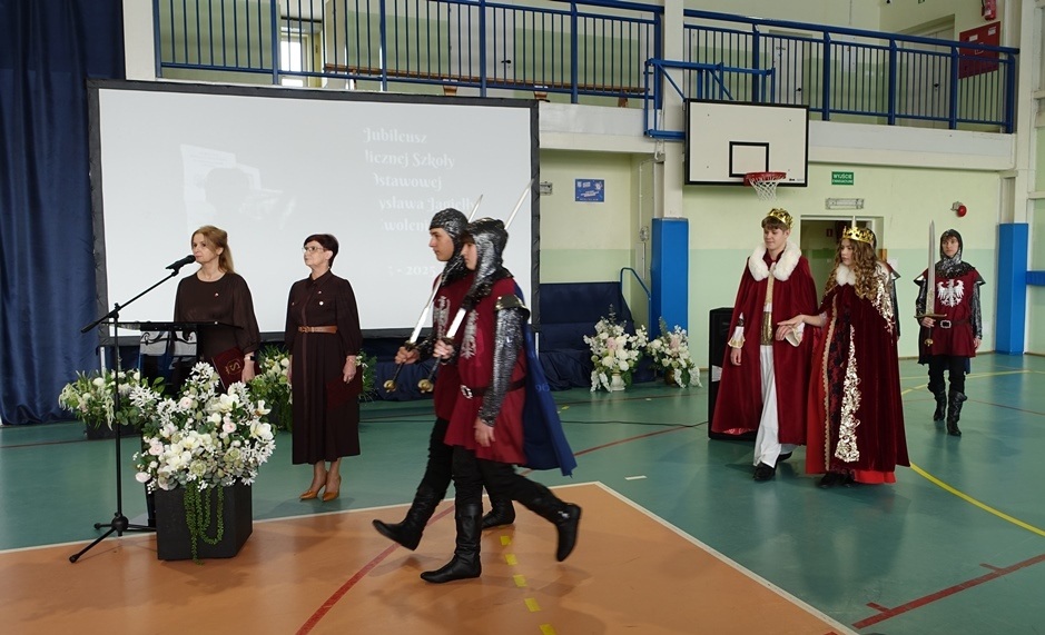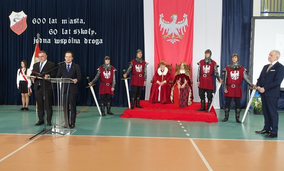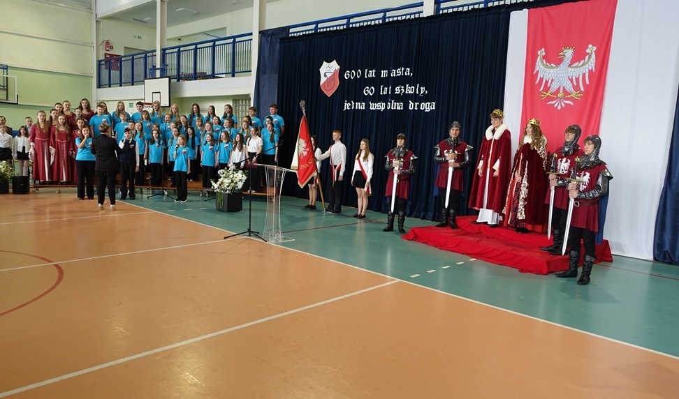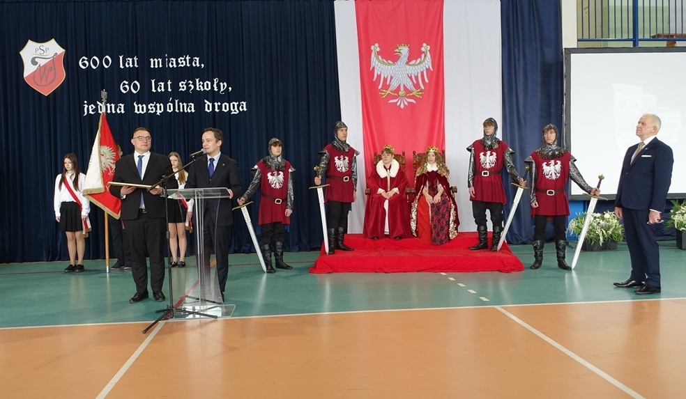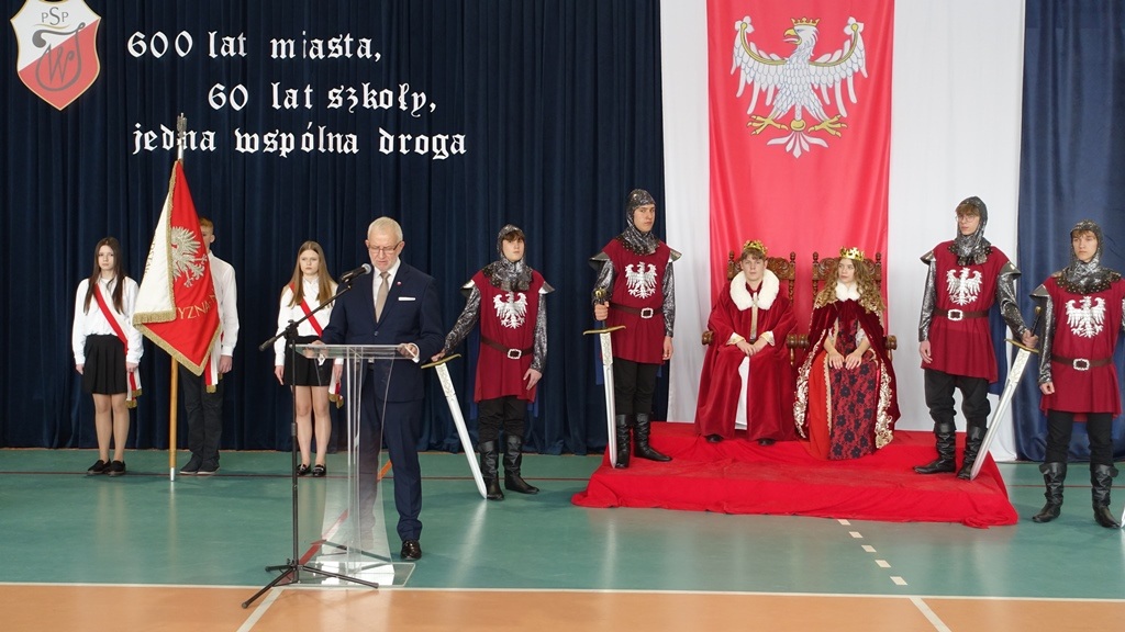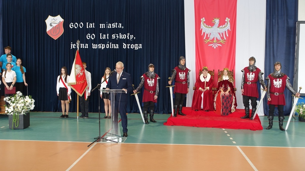 Uroczystość rozpoczęła się w podniosłej atmosferze od wprowadzenia pocztu sztandarowego. Chwilę później na salę wkroczył król Władysław Jagiełło wraz z królową i orszakiem rycerzy, nawiązując do historycznych tradycji miasta i jubileuszu 600-lecia nadania praw miejskich. Ten symboliczny akcent podkreślił ciągłość historii oraz znaczenie edukacji w budowaniu tożsamości lokalnej społeczności.
