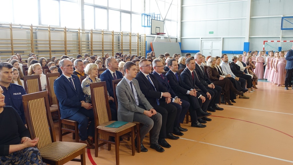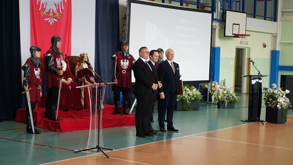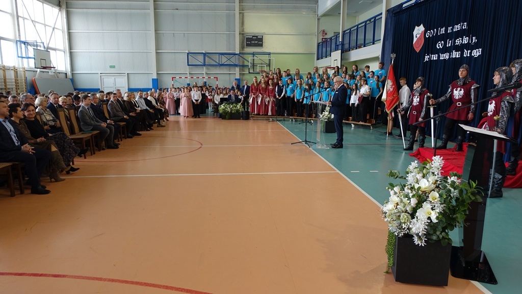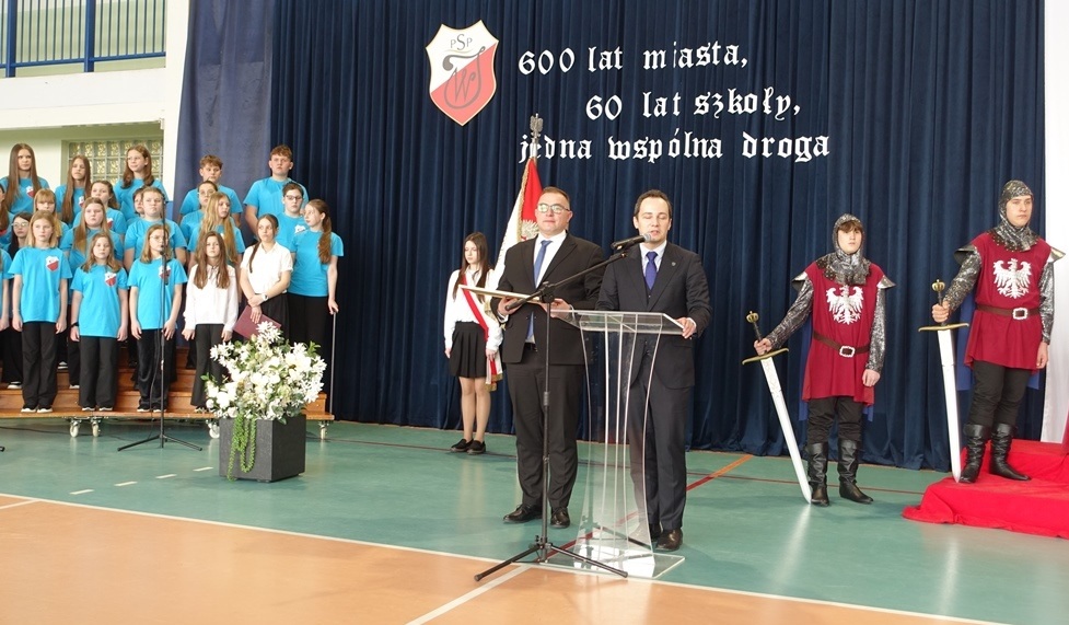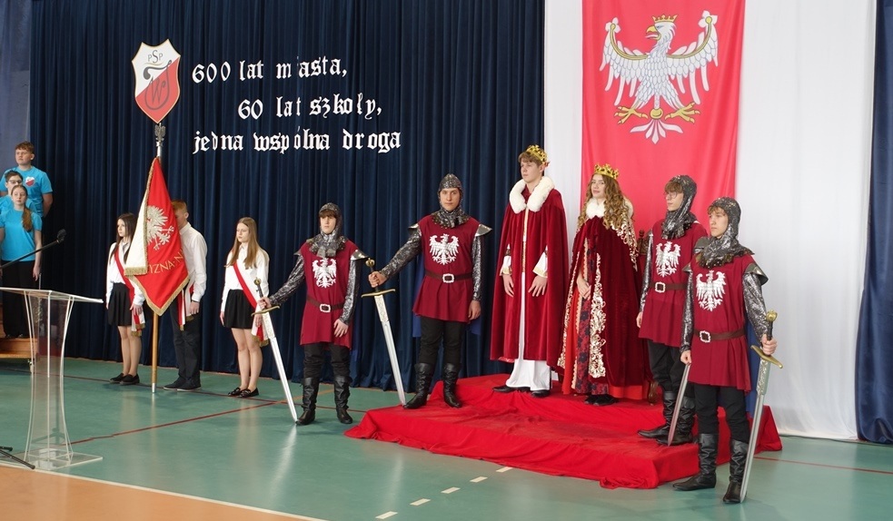 Uroczystość rozpoczęła się w podniosłej atmosferze od wprowadzenia pocztu sztandarowego. Chwilę później na salę wkroczył król Władysław Jagiełło wraz z królową i orszakiem rycerzy, nawiązując do historycznych tradycji miasta i jubileuszu 600-lecia nadania praw miejskich. Ten symboliczny akcent podkreślił ciągłość historii oraz znaczenie edukacji w budowaniu tożsamości lokalnej społeczności.