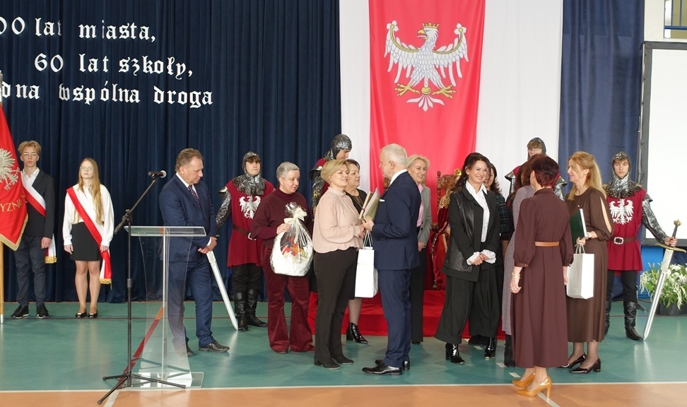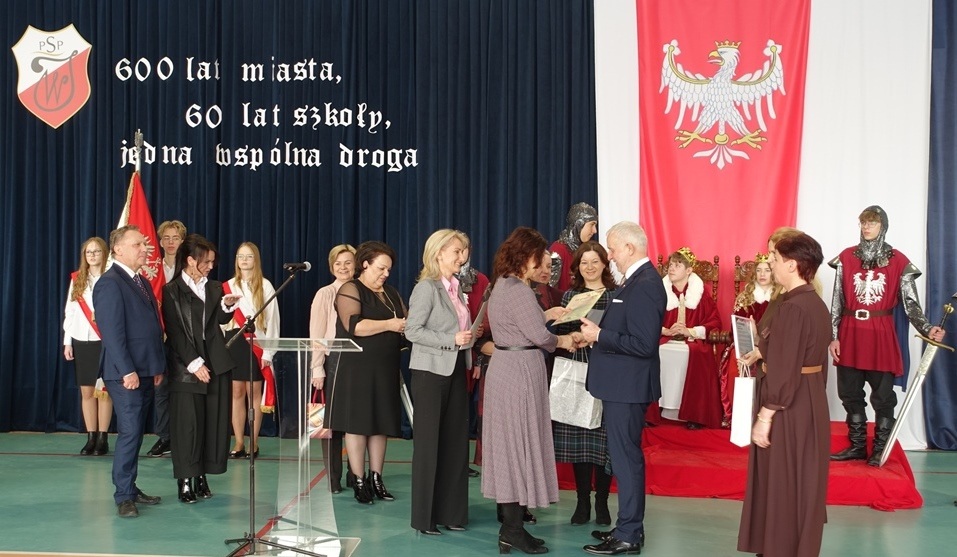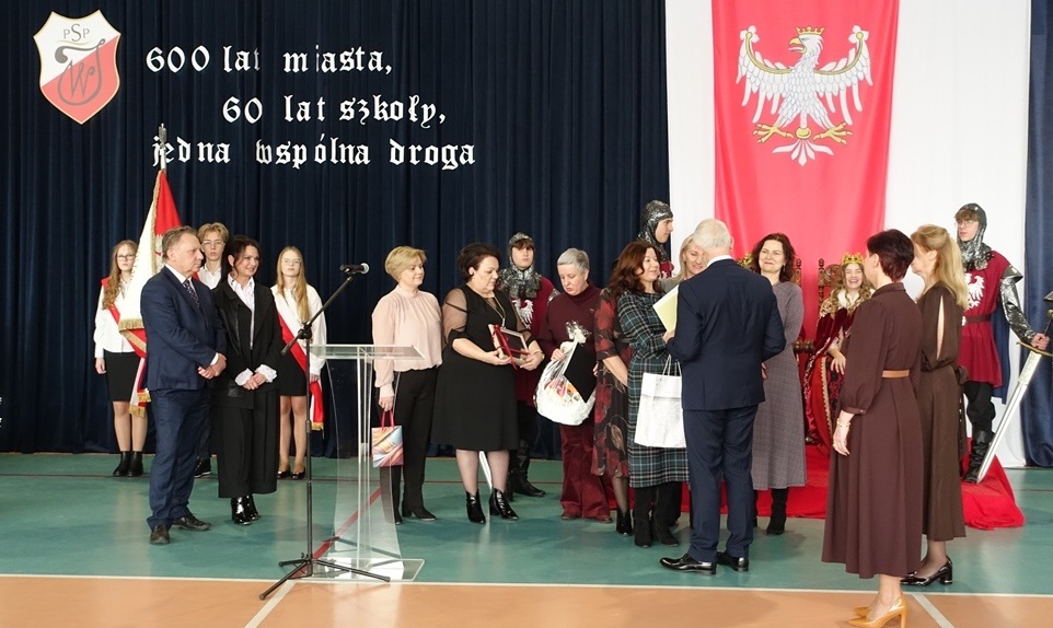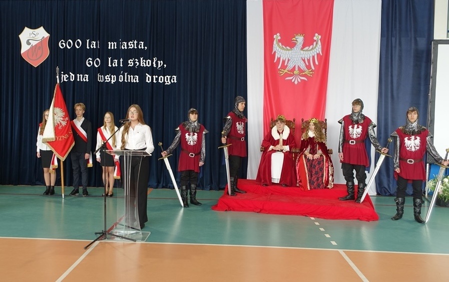 Uroczystość rozpoczęła się w podniosłej atmosferze od wprowadzenia pocztu sztandarowego. Chwilę później na salę wkroczył król Władysław Jagiełło wraz z królową i orszakiem rycerzy, nawiązując do historycznych tradycji miasta i jubileuszu 600-lecia nadania praw miejskich. Ten symboliczny akcent podkreślił ciągłość historii oraz znaczenie edukacji w budowaniu tożsamości lokalnej społeczności.