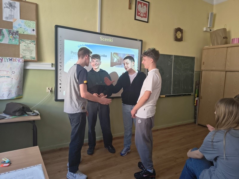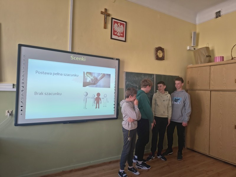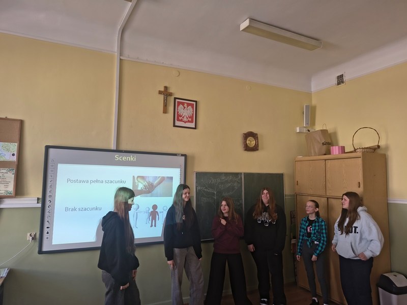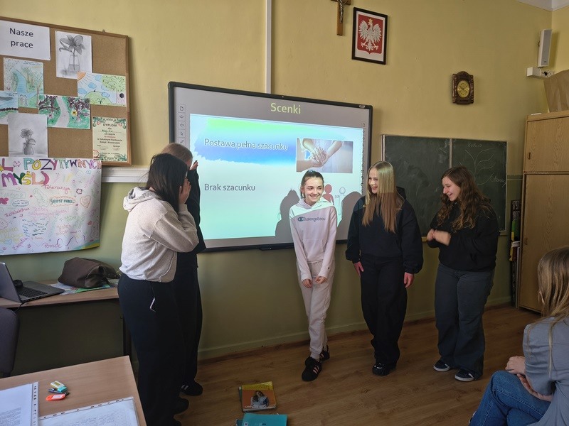 Młodzież odegrała również scenki, które przedstawiały postawę pełną respektu bądź braku poszanowania – co zdecydowanie pozwoliło przybliżyć im temat z perspektywy doświadczenia.