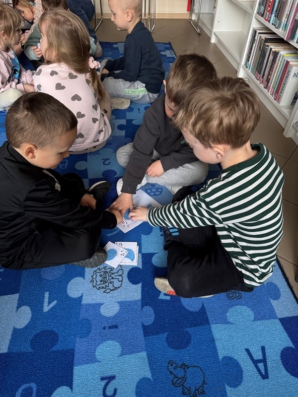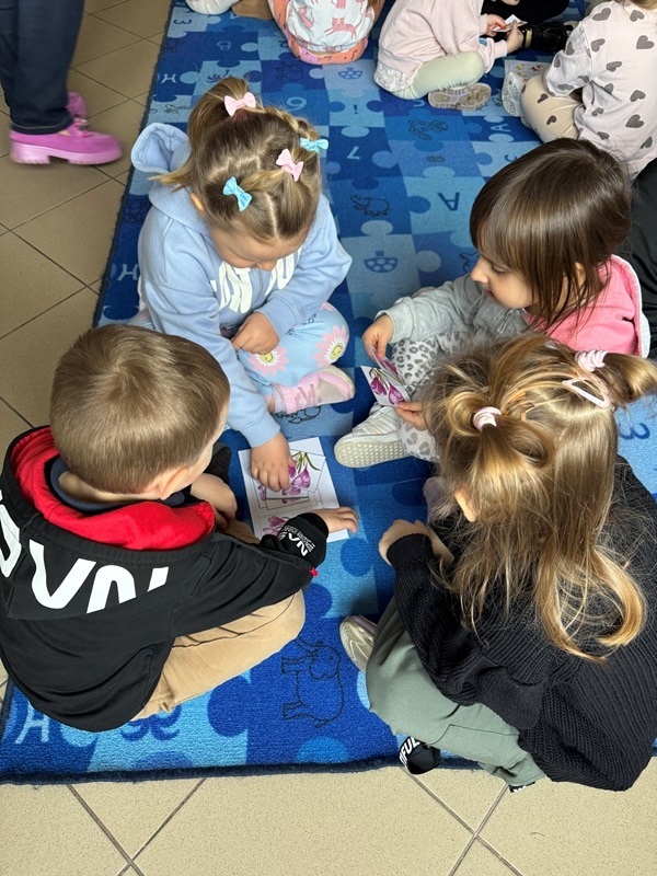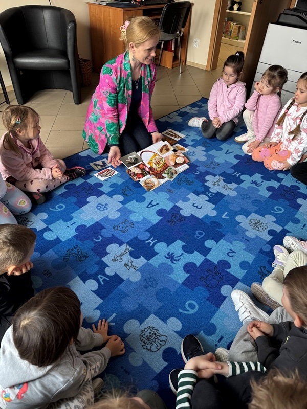 Już od samego początku na maluchy czekało mnóstwo atrakcji. Na terenie przyległym do biblioteki dzieci wyruszyły na poszukiwanie kolorowych pisanek, które z wielkim zaangażowaniem zbierały do swoich koszyczków. Zabawa wywołała wiele uśmiechów i radosnych okrzyków – każdy chciał znaleźć jak najwięcej ukrytych skarbów! Podczas zajęć przedszkolaki rozmawiały o wiośnie – o tym, jak przyroda budzi się do życia, jakie rośliny zaczynają kwitnąć oraz jakie zwierzęta pojawiają się po zimowym odpoczynku. Dzieci z zainteresowaniem słuchały także opowieści o tradycjach wielkanocnych, poznając zwyczaje związane z tym wyjątkowym świętem. Nie zabrakło również emocjonującego quizu świątecznego. Mali uczestnicy chętnie odpowiadali na pytania, wykazując się dużą wiedzą i spostrzegawczością. Nagrodą za ich zaangażowanie były pyszne, czekoladowe jajka, które sprawiły dzieciom ogromną radość. Kolejną atrakcją było dopasowywanie produktów do koszyczka wielkanocnego. Przedszkolaki świetnie poradziły sobie z tym zadaniem, ucząc się jednocześnie, jakie symbole i pokarmy powinny znaleźć się w tradycyjnej święconce. Zajęcia były wspaniałe i na długo pozostaną w pamięci dzieci. Serdecznie dziękujemy wszystkim bibliotekarzom za ogromne zaangażowanie, ciepło oraz przygotowanie tak ciekawych i inspirujących aktywności.
