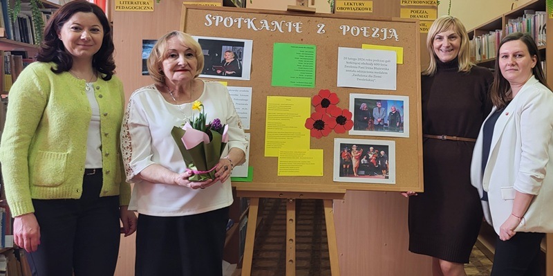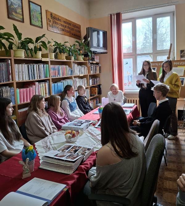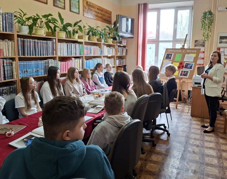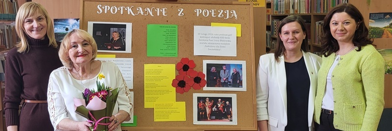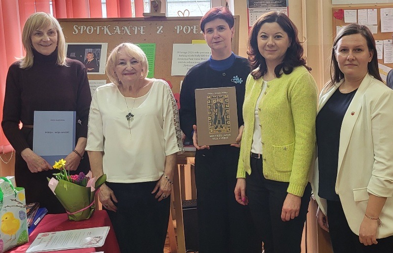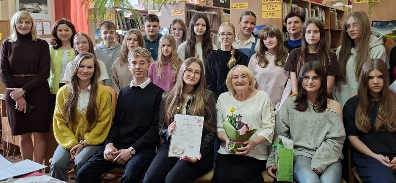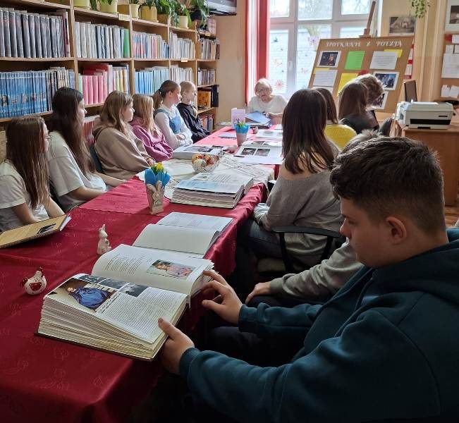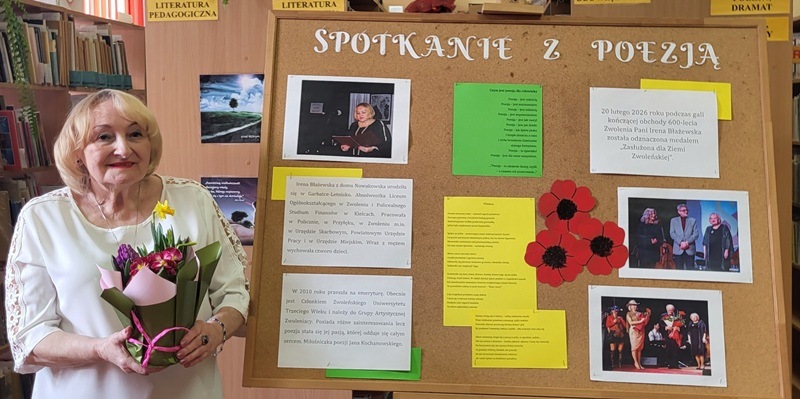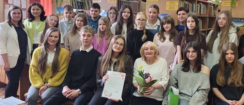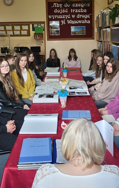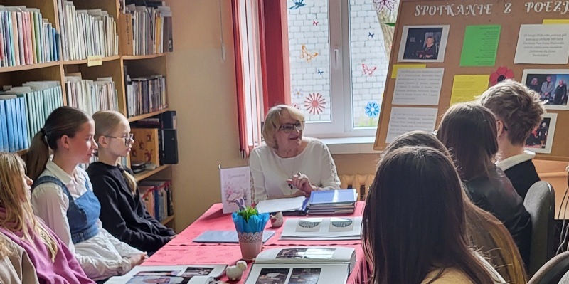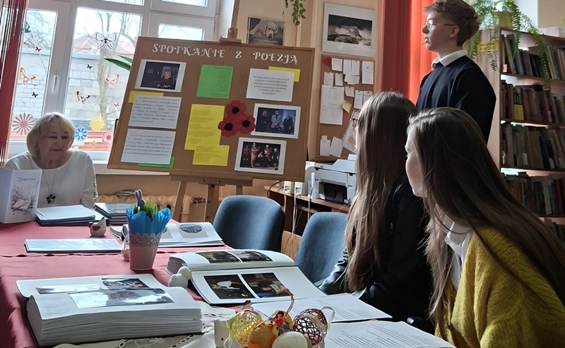 Z tej okazji w bibliotece szkolnej przy ul. Kościelnej odbyło się spotkanie autorskie z naszą lokalną poetką – Panią Ireną Błażewską, zatytułowane „Wiosenne spotkanie z poezją”. W wydarzeniu uczestniczyli łącznicy oraz aktyw biblioteczny. W odpowiedni nastrój wprowadzili nas uczniowie klasy 8e: Julia, Lena i Dawid, którzy wyrecytowali wiersze „Poezja” i „Wiosna”. Poetka przybliżyła młodzieży swoją biografię, a także zaprezentowała wybrane utwory. Uczniowie mieli możliwość obejrzenia kronik, w których autorka gromadzi artykuły i fotografie dokumentujące jej twórczość. Nie zabrakło również czasu na zadawanie pytań. Spotkanie przebiegało w atmosferze refleksji i wzruszeń, a jego wyjątkowy klimat tworzyli wszyscy uczestnicy. Wydarzenie zostało zorganizowane we współpracy z nauczycielami Biblioteki Pedagogicznej w Radomiu – Filia w Zwoleniu.